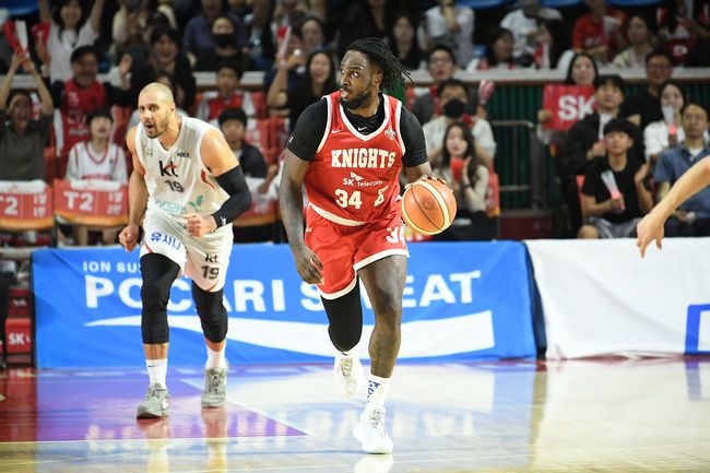 자밀 워니를 앞세운 서울 SK가 플레이오프서 기선제압에 성공했다. 서울 SK는 23일 서울잠실학생체육관에서 열린 2024-2025 KCC 프로농구 플레이오프서 수원 KT에 65-61로 승리했다. 이날 승리로 SK는 기선제압에 성공, 통합 챔피언을 향한 행보를 이어갔다. SK는 외국인 선수 자밀 워니가 21점-9리바운드-4어시스트를 배달하며 공수에서 큰 활약