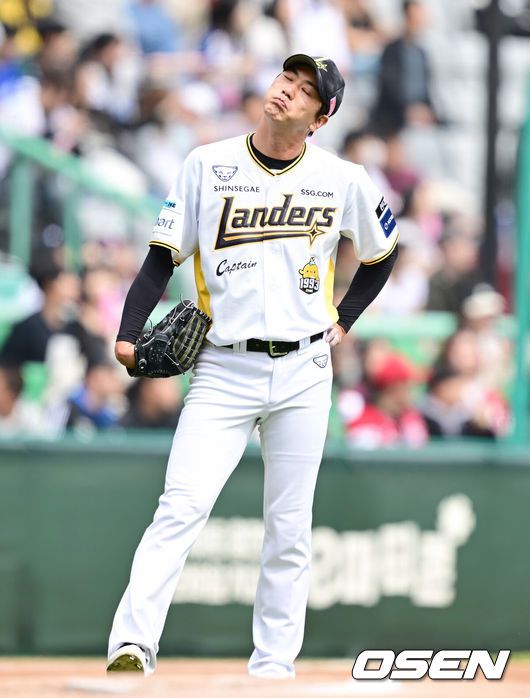 27일 인천 미추홀구 SSG랜더스필드에서 '2025 신한 SOL Bank KBO리그' SSG 랜더스와 키움 히어로즈의 경기가 열렸다. 홈팀 SSG는 김광현, 키움은 하영민을 선발로 내세웠다. 3회초 2사 만루 SSG 김광현이 키움 오선진에게 만루 홈런을 허용, ㅇ쉬워하고 있다. 2025.04.27 / ksl0919@osen.co.kr 프로야구 SSG 랜더스