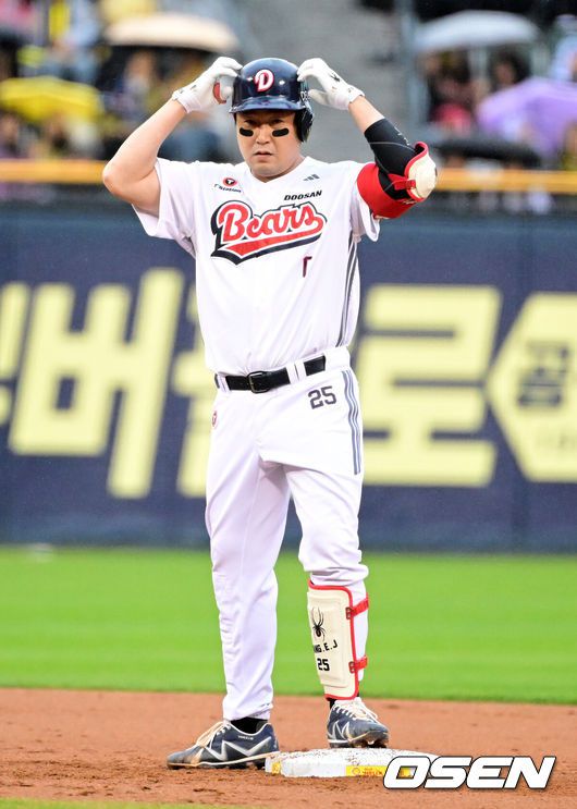 19일 오후 서울 잠실구장에서 2025 신한 SOL뱅크 KBO리그 두산 베어스와 KIA 타이거즈의 경기가 열렸다.이날 두산은 최원준, KIA는 아담 올러를 선발로 내세웠다.3회말 2사 3루에서 두산 양의지가 1타점 적시 2루타를 날리며 기뻐하고 있다. 2025.04.19 / jpnews@osen.co.kr 두산 주전포수 양의지가 옆구리 부상을 털고 돌아왔다