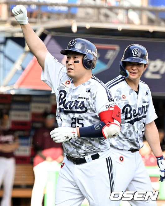 14일 서울 잠실야구장에서 2024 신한 SOL Bank KBO리그 두산 베어스와 키움 히어로즈의 경기가 열렸다.이날 홈팀 두산은 최승용을, 원정팀 키움은 알칸타라를 선발 투수로 내세웠다.4회말 두산 선두타자 양의지가 좌월 솔로 홈런을 날린 뒤 기뻐하고 있다. 2025.06.14 /cej@osen.co.kr 두산의 24일 SSG 선발 라인업이 공개됐다. 프