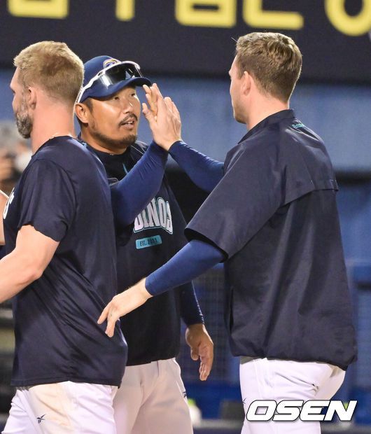 NC 다이노스가 17일 서울 잠실야구장에서 열린 2025 신한은행 SOL Bank KBO리그 LG와의 원정 경기에서 6-2로 승리했다. 2연패를 끊은 NC는 30승 4무 33패로 8위를 유지했다. 2연패를 당한 LG는 40승 2무 28패로 2위에 머물렀다경기종료 후 NC 이호준 감독이 시즌 9승 달성한 라일리와 하이파이브를 하고 있다. 2025.06.17