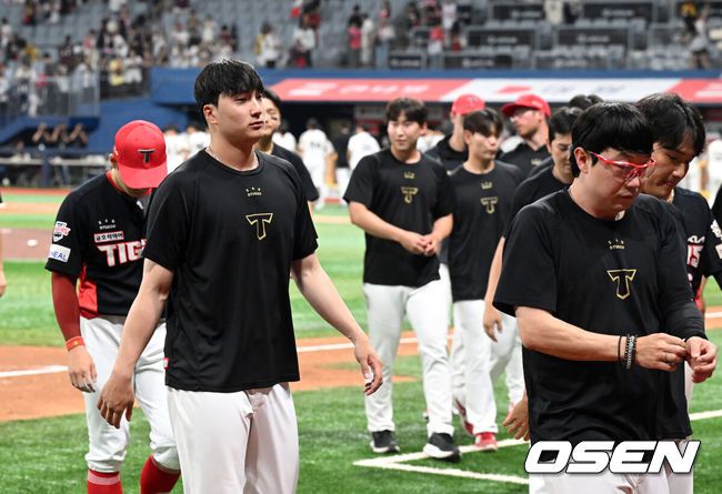프로야구 키움 히어로즈와 KIA 타이거즈가 무승부를 기록했다. 키움과 KIA는 26일 서울 고척 스카이돔에서 열린 2025 KBO리그 시즌 12차전 맞대결에서 연장 11회 5-5 무승부를 기록했다. 경기 종료 후 KIA 선수들이 그라운드를 나가고 있다. 2025.06.26 /sunday@osen.co.kr 프로야구 KIA 타이거즈가 연장 11회 무승부 후유