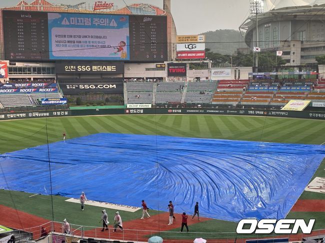 ‘폭염에 이어서 소나기’ SSG-KT, 경기 정상개시 불투명…그라운드에 황급히 방수포 설치 [오!쎈 인천]