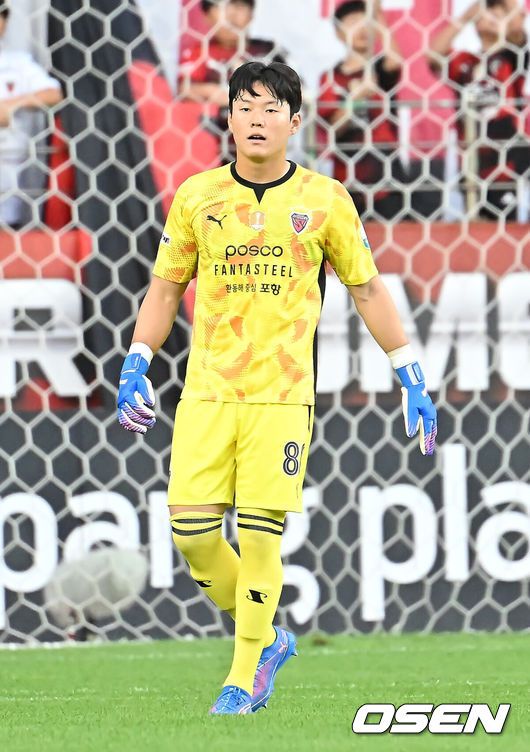 19일 포항 스틸야드에서 하나은행 K리그1 2025 포항 스틸러스와 전북 현대의 경기가 열렸다. 포항으로 이적한 기성용이 포항 유니폼을 입고 첫 출전한다. 포항 스틸러스 홍성민 골키퍼가 경기에 출전하고 있다. 2025.07.19 / foto0307@osen.co.kr '기성용 장학재단 장학생' 홍성민(19)이 기성용(36, 이상 포항)과 함께 데뷔전을 치렀