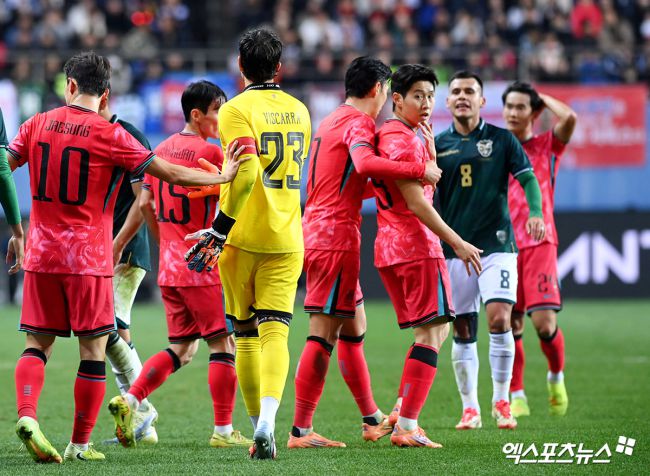 14일 오후 대전월드컵경기장에서 열린 대한민국과 볼리비아의 남자 축구 대표팀 친선경기, 손흥민이 볼리비아와 신경전을 벌이는 이강인을 말리고 있다. 고아라 기자 iknow@xportsnews.com