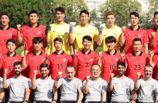 [도하(카타르)=뉴시스] 조성우 기자 = 대한민국 축구대표팀 파울루 벤투 감독과 선수들이 16일(현지시간) 오전 카타르 도하 알 에글라 트레이닝센터에서 단체사진 촬영을 하고 있다. 2022.11.16. xconfind@newsis.com [사진 영상 제보받습니다] 공감언론 뉴시스가 독자 여러분의 소중한 제보를 기다립니다. 뉴스 가치나 화제성이 있다고 판단되