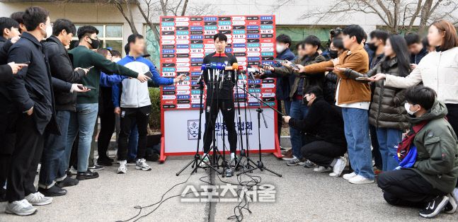 한국 축구국가대표팀에 소집된 손흥민(가운데)이 21일 경기도 파주 축구국가대표트레이닝센터(NFC)에서 훈련을 앞두고 취재진과 인터뷰를 하고 있다. 한국 축구국가대표팀은 24일 콜롬비아, 28일 우루과이와 연이어 평가전을 치른다. 2023. 3. 21. 파주 | 박진업기자 upandup@sportsseoul.com [기사제보 news@sportsseoul.c