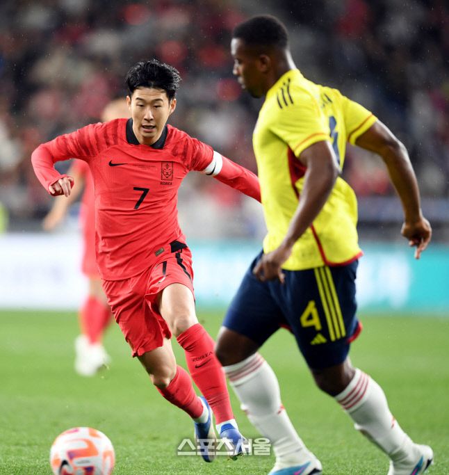 손흥민이 24일 울산문수축구경기장에서 열린 콜롬비아와 축구 국가대표 평가전에서 수비에 가담하고 있다. 2023. 3. 24. 울산 | 최승섭기자 thunder@sportsseoul.com [기사제보 news@sportsseoul.com] Copyright ⓒ 스포츠서울&sportsseoul.com