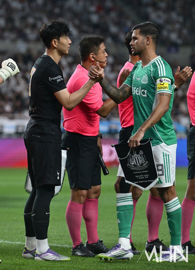 '2025 쿠팡플레이 시리즈' 잉글랜드 프로축구 프리미어리그(EPL) 토트넘 홋스퍼와 뉴캐슬 유나이티드 FC의 경기가 3일 오후 서울 마포구 서울월드컵경기장에서 열렸다. 토트넘 손흥민이 뉴캐슬 기마랑이스와 인사를 나누고 있다. 한편, 손흥민은 잉글랜드 프로축구 프리미어리그(EPL) 토트넘 홋스퍼와 10년간의 동행을 마무리하고 새로운 도전에 나서기로 결정했다