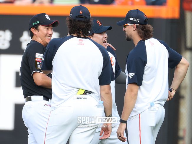 2025 신한 SOL Bank KBO리그 한화 이글스와 KT 위즈의 경기가 5일 오후 대전 한화생명 볼파크에서 열린다. 한화 류현진과 KT 제춘모 코치가 인사를 나누고 있다. <저작권자 ⓒ SPOTV NEWS. 무단전재 및 재배포 금지>