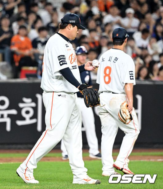 21일 오후 대전 한화생명볼파크에서 2025 신한 SOL Bank KBO리그 한화 이글스와 두산 베어스의 경기가 열렸다. 한화는 류현진, 두산은 콜어빈을 선발로 내세웠다. 7회초 무사 1,2루에서 두산 안재석에게 번트 안타를 허용한 한화 류현진이 아쉬워하고 있다. 2025.08.21 /sunday@osen.co.kr