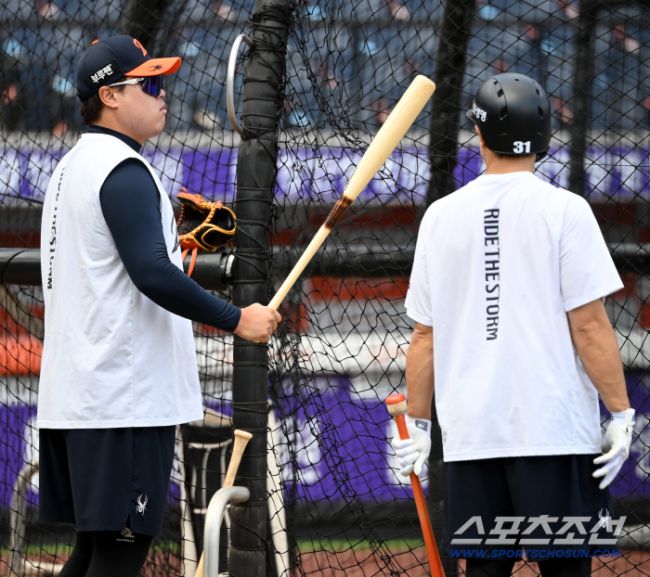 3일 대전 한화생명볼파크에서 열린 NC와 한화의 경기, 한화 류현진이 타격훈련 중인 손아섭과 이야기를 하고 있다. 대전=허상욱 기자wook@sportschosun.com/2025.09.03/ 3일 대전 한화생명볼파크에서 열린 NC와 한화의 경기, 한화 류현진이 타격훈련 중인 손아섭과 이야기를 하고 있다. 대전=허상욱 기자wook@sportschosun.co