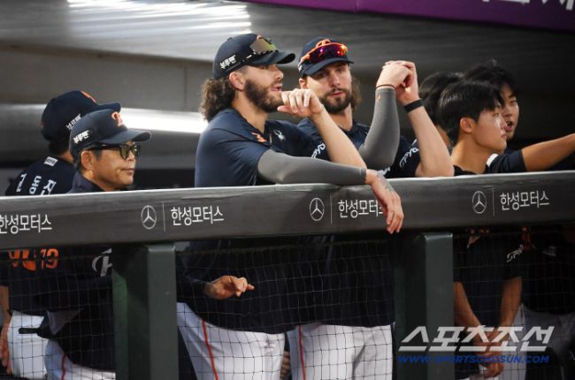 10일 부산 사직구장에서 열린 롯데 자이언츠와 한화 이글스의 경기. 한화 폰세, 와이스, 정우주가 류현진 피칭을 지켜보고 있다. 부산=박재만 기자 pjm@sportschosun.com/2025.09.10/ 10일 부산 사직구장에서 열린 롯데 자이언츠와 한화 이글스의 경기. 한화 폰세, 와이스, 정우주가 류현진 피칭을 지켜보고 있다. 부산=박재만 기자 pjm