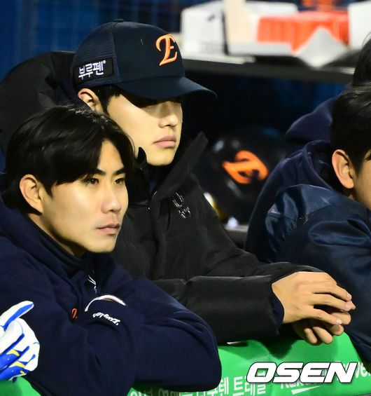 27일 오후 서울 잠실야구장에서 2025 신한 SOL Bank KBO리그 포스트시즌 한국시리즈 2차전 LG 트윈스와 한화 이글스의 경기가 열렸다. LG는 임찬규, 한화는 류현진을 선발 투수로 내세웠다. 한화 문동주가 경기를 지켜보고 있다. 2025.10.27 /jpnews@osen.co.kr