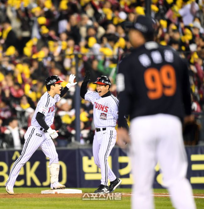 LG 구본혁(왼쪽)이 27일 잠실구장에서 열린 2025 KBO리그 한화와의 한국시리즈 2차전 2회말 무사 2-3루 상황에서 한화 선발 류현진을 상대로2타점 적시타를 치고 송지만 코치와 하이파이브를 하며 기뻐하고 있다. 2025. 10. 27. 잠실 | 박진업 기자 upandup@sportsseoul.com [기사제보 news@sportsseoul.com]