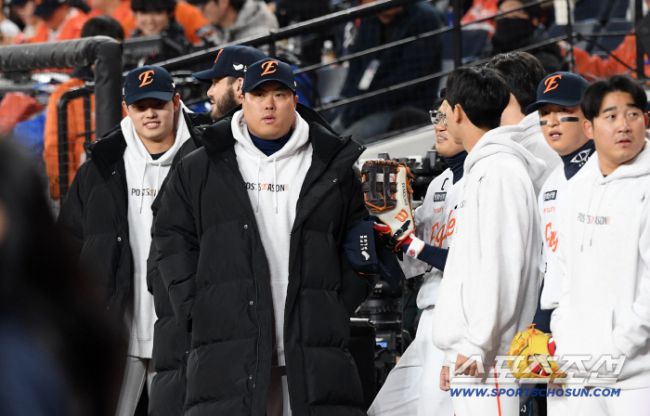 30일 대전 한화생명볼파크에서 열린 한국시리즈 4차전 한화 이글스와 LG 트윈스의 경기. 한화 문동주, 폰세, 류현진이 경기를 준비하고 있다. 대전=박재만 기자 pjm@sportschosun.com/2025.10.30/ 30일 대전 한화생명볼파크에서 열린 한국시리즈 4차전 한화 이글스와 LG 트윈스의 경기. 한화 문동주, 폰세, 류현진이 경기를 준비하고 있