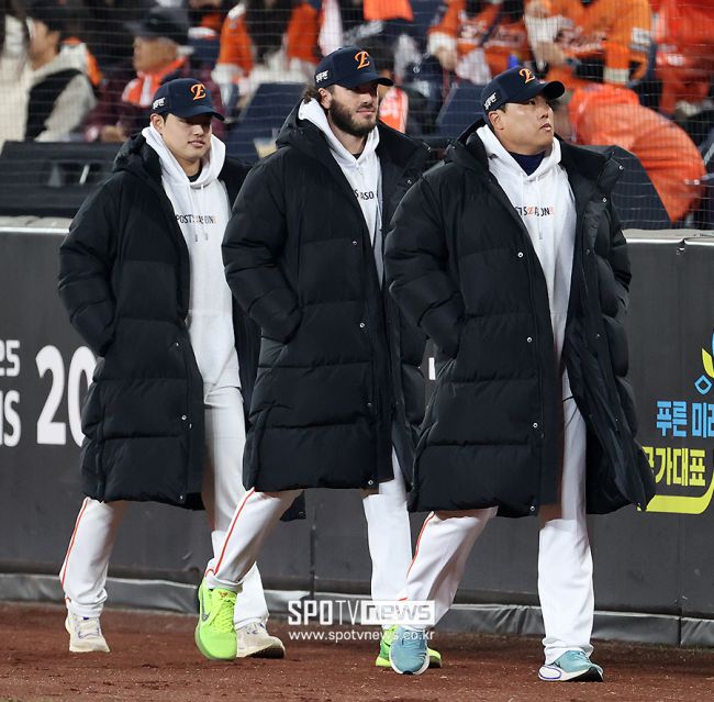 2025 신한 SOL뱅크 KBO 한국시리즈 한화와 LG의 4차전이 30일 오후 대전 한화생명 볼파크에서 열렸다. 한화 문동주, 폰세, 류현진이 더그아웃으로 향하고 있다. <저작권자 ⓒ SPOTV NEWS. 무단전재 및 재배포 금지>