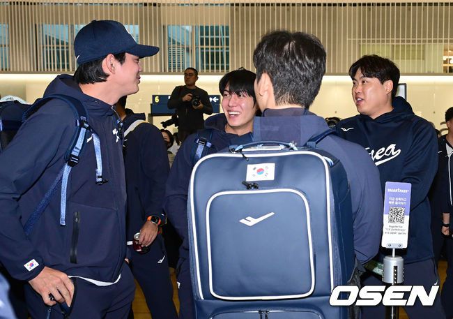 류지현 감독이 이끄는 한국 야구대표팀이 오는 3월 열리는 WBC를 준비하기 위해 9일 오전 인천공항을 통해 미국령 사이판으로 출국했다. 류지현호는 9일부터 21일까지 사이판에서 1차 전지훈련 담금질에 나선다. 대표팀 류현진, 원태인, 구자욱이 출국 수속을 앞두고 대화를 나누고 있다. 2026.01.09 / dreamer@osen.co.kr