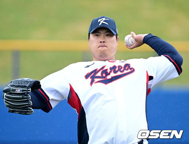 2026 WBC(월드베이스볼클래식)를 준비하는 대한민국 야구 대표팀이 27일 일본 오키나와 가데나 야구장에서 훈련을 펼쳤다. 야구 대표팀은 KT와 오키나와에서의 마지막 연습경기를 가지려 했으나 우천으로 취소돼 훈련만 진행했다. 대표팀 류현진이 캐치볼로 몸을 풀고 있다. 2026.02.27 / dreamer@osen.co.kr