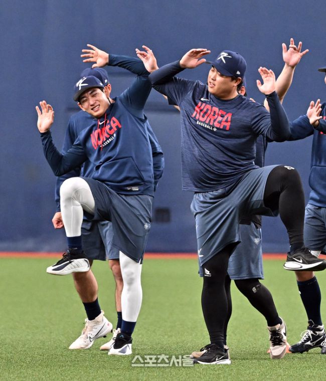WBC 대한민국 야구대표팀의 이정후(왼쪽)와 류현진이 3일 일본 오사카 교세라돔에서 열리는 오릭스 버팔로스와의 연습경기에 앞서 몸을 풀고 있다. 2026. 3. 3. 오사카 | 박진업 기자 upandup@sportsseoul.com [기사제보 news@sportsseoul.com] Copyright ⓒ 스포츠서울&sportsseoul.com
