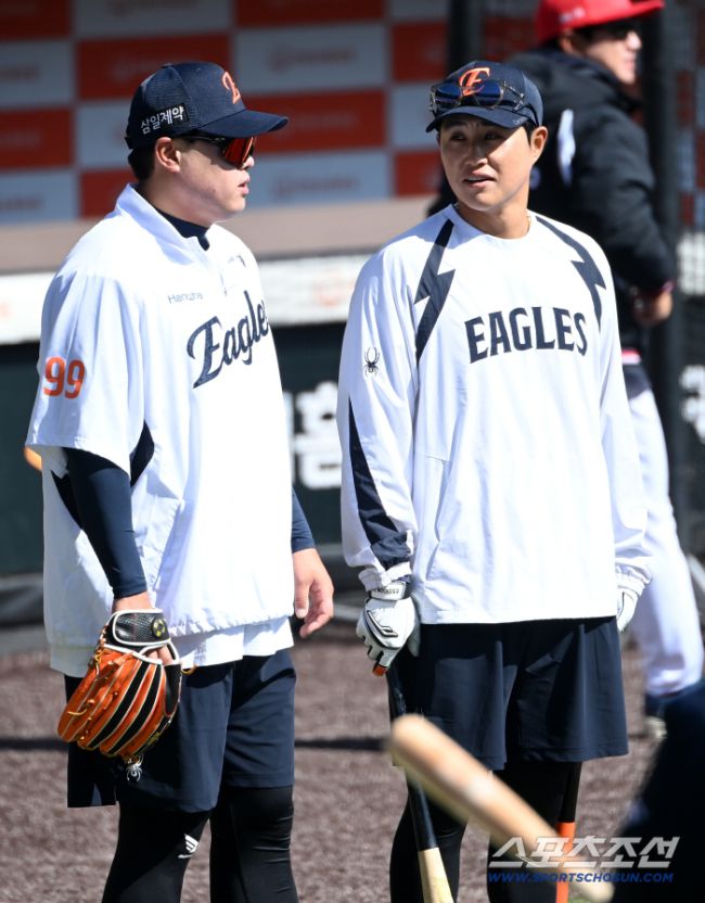 19일 대전한화생명볼파크에서 열린 KIA와 한화의 시범경기. 한화 류현진과 채은성이 이야기를 나누고 있다. 대전=허상욱 기자wook@sportschosun.com/2026.03.19/ 19일 대전한화생명볼파크에서 열린 KIA와 한화의 시범경기. 한화 류현진과 채은성이 이야기를 나누고 있다. 대전=허상욱 기자wook@sportschosun.com/2026.0