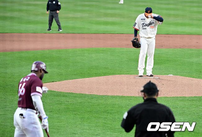 11일 오후 대전 한화생명볼파크에서 2025 신한 SOL Bank KBO리그 한화 이글스와 키움 히어로즈의 경기가 열렸다. 이날 한화는 류현진, 키움은 김윤하를 선발로 내세웠다. 1회초 1사에서 키움 푸이그가 타석에 들어서며 한화 류현진과 인사를 나누고 있다. 2025.04.11 / jpnews@osen.co.kr