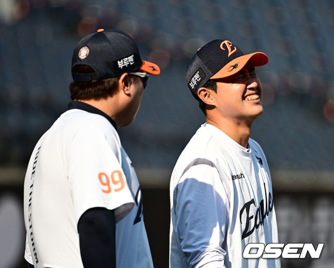 29일 대전 한화생명볼파크에서 2025 신한 SOL Bank KBO리그 한화 이글스와 LG 트윈스의 경기가 열렸다. 이날 한화는 우완 라이언 와이스, LG는 좌완 송승기가 선발로 나섰다. 경기에 앞서 한화 류현진 채은성이 훈련을 하며 이야기를 나누고 있다. 2025.04.29 /jpnews@osen.co.kr