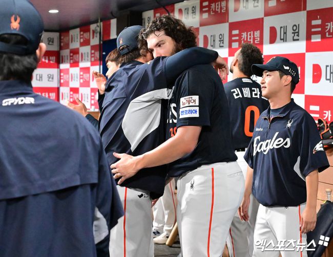 4일 오후 서울 구로구 고척스카이돔에서 열린 '2025 신한 SOL Bank KBO리그' 한화 이글스와 키움 히어로즈의 경기, 7회말 투구를 마친 한화 폰세가 류현진과 포옹을 하고 있다. 김한준 기자 kowel@xportsnews.com