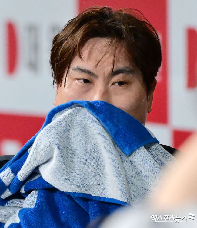 5일 오후 서울 구로구 고척스카이돔에서 열린 '2025 신한 SOL Bank KBO리그' 한화 이글스와 키움 히어로즈의 경기, 4회말 수비를 마친 한화 류현진이 땀을 닦고 있다. 김한준 기자 kowel@xportsnews.com