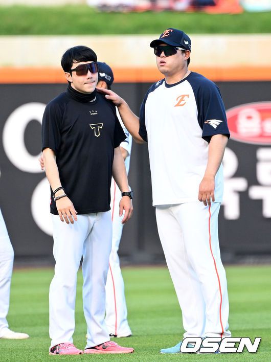 8일 오후 대전 한화생명볼파크에서 2025 신한 SOL Bank KBO리그 한화 이글스와 KIA 타이거즈의 경기가 열렸다. 한화는 문동주, KIA는 윤영철을 선발로 내세웠다. 경기에 앞서 KIA 양현종과 한화 류현진이 인사를 나누고 있다. 2025.07.08 /sunday@osen.co.kr