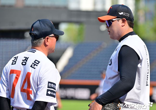 30일 오후 대전 한화생명 볼파크에서 열리는 '2025 신한 SOL Bank KBO리그' 삼성 라이온즈와 한화 이글스의 경기, 한화 김경문 감독이 류현진과 대화를 나누고 있다. 김한준 기자 kowel@xportsnews.com
