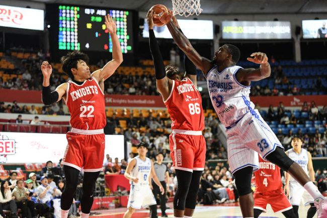 [서울=뉴시스] 프로농구 서울 SK의 대릴 먼로. (사진=KBL 제공) *재판매 및 DB 금지 [서울=뉴시스] 김진엽 기자 = 프로농구 서울 SK가 대구 한국가스공사를 누르고 연패 탈출에 성공했다. SK는 31일 오후 7시 서울 잠실학생체육관에서 열린 한국가스공사와의 2025~2026시즌 LG전자 프로농구 정규리그 홈 경기에서 79-71 승리를 거뒀다. 이