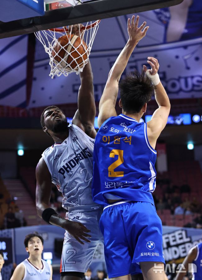 [서울=뉴시스] 최진석 기자 = 3일 서울 송파구 잠실실내체육관에서 열린 2025-2026 KBL 프로농구 울산 현대모비스와 서울 삼성의 경기, 현대모비스 레이션 해먼즈가 삼성 이원석을 앞에 두고 원핸드덩크를 하고 있다. 2025.11.03. myjs@newsis.com [사진 영상 제보받습니다] 공감언론 뉴시스가 독자 여러분의 소중한 제보를 기다립니다.
