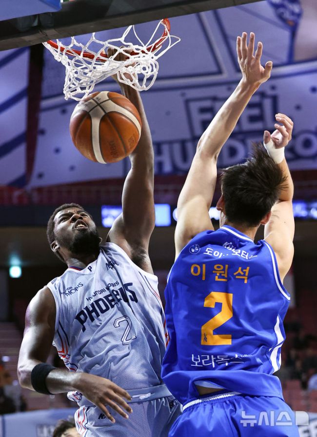[서울=뉴시스] 최진석 기자 = 3일 서울 송파구 잠실실내체육관에서 열린 2025-2026 KBL 프로농구 울산 현대모비스와 서울 삼성의 경기, 현대모비스 레이션 해먼즈가 삼성 이원석을 앞에 두고 원핸드덩크를 하고 있다. 2025.11.03. myjs@newsis.com [사진 영상 제보받습니다] 공감언론 뉴시스가 독자 여러분의 소중한 제보를 기다립니다.