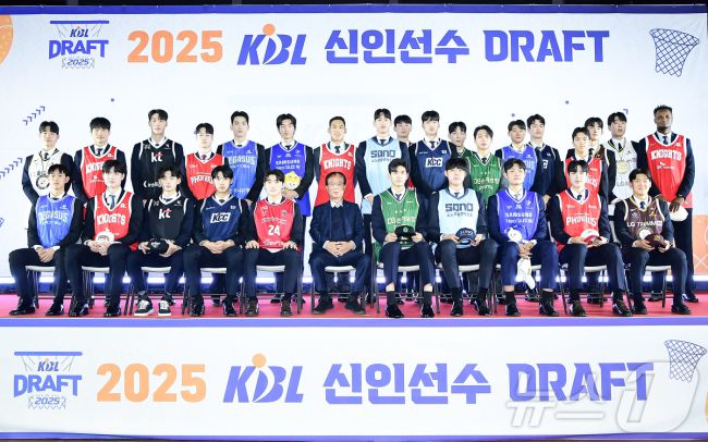 (서울=뉴스1) = 14일 오후 서울 송파구 잠실학생체육관에서 열린 2025 KBL 신인선수 드래프트에서 10개 구단의 선택을 받은 선수들이 기념 촬영을 하고 있다. (KBL 제공. 재판매 및 DB 금지) 2025.11.14/뉴스1 pjh2035@news1.kr Copyright ⓒ 뉴스1. All rights reserved. 무단 전재 및 재배포, AI