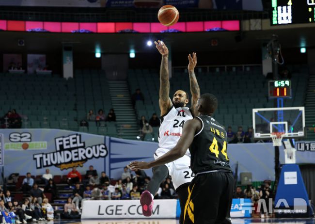 [서울=뉴시스] 이영환 기자 = 5일 오후 서울 송파구 잠실실내체육관에서 열린 2025-2026 KBL 서울 삼성과 수원 KT의 경기, KT 데릭 윌리엄스가 슛을 하고 있다. 2025.12.05. 20hwan@newsis.com [사진 영상 제보받습니다] 공감언론 뉴시스가 독자 여러분의 소중한 제보를 기다립니다. 뉴스 가치나 화제성이 있다고 판단되는 사진