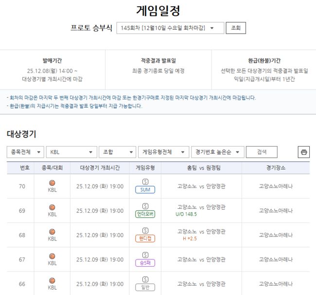2025-2026 KBL 소노-정관장전 대상 프로토 승부식 145회차 게임 마감 앞둬 일반, 승5패, 핸디캡, 언더오버, SUM 등 다양한 유형으로 발매…12월 9일(화) 오후 7시까지 구매 가능 서울올림픽기념국민체육진흥공단(이사장 하형주)이 발행하는 체육진흥투표권 스포츠토토의 수탁사업자 한국스포츠레저㈜가 오는 12월 9일(화) 오후 7시에 고양소노아레나에
