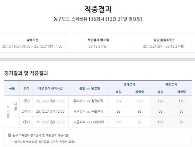 '100만 배 넘는 고배당 적중 발생'...농구토토 스페셜N 136회차적중결과 발표