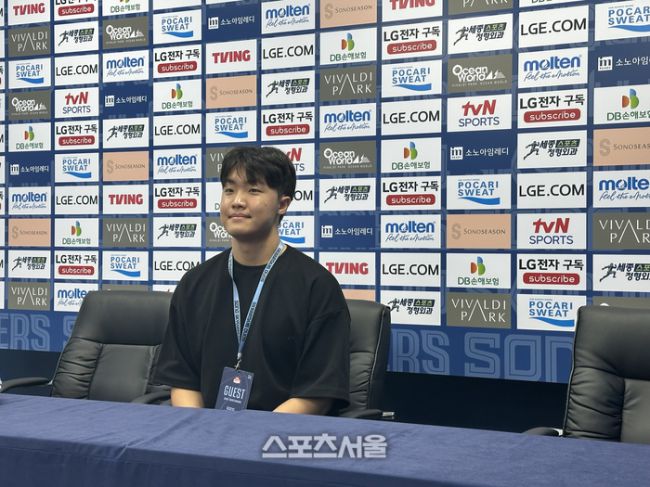 한화 정우주가 3일 고양소노아레나에서 열린 2025~2026 LG전자 프로농구 정규리그 고양 소노와 수원 KT전에서 시투를 앞두고 취재진의 인터뷰에 응하고 있다. 고양 | 이소영 기자 sshong@sportsseoul.com 그라운드에서는 날카로운 직구로 상대를 제압하지만, 코트 앞에서는 속수무책이었다. 한화 초특급 유망주 정우주(20)가 농구장을 찾은 가