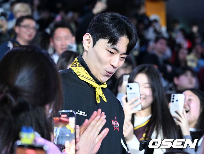 18일 서울 잠실실내체육관에서 2025~2026시즌 LG전자 프로농구 올스타전이 열렸다. 팬 투표와 선수단 투표, 감독 추천 선수로 이름을 올린 KBL 스타 24명이 유기상(LG)을 앞세운 '팀 브라운', 이정현(소노)이 선봉에 서는 '팀 코니'로 나뉘어 대결한다. 경기에 앞서 팀 브라운 유기상이 등장하며 팬들과 하이파이브를 하고 있다. 2026.01.18