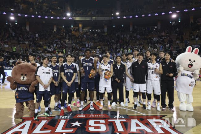 [서울=뉴시스] 김근수 기자 = 18일 오후 서울 송파구 잠실실내체육관에서 열린 2025-2026 LG전자 프로농구 올스타전 TEAM 브라운 대 TEAM 코니의 경기에서 TEAM 브라운이 TEAM 코니를 131-109로 승리, 양팀 선수들이 기념촬영을 하고 있다. 2026.01.18. ks@newsis.com [서울=뉴시스] 이영환 김진엽 김근수 기자 =