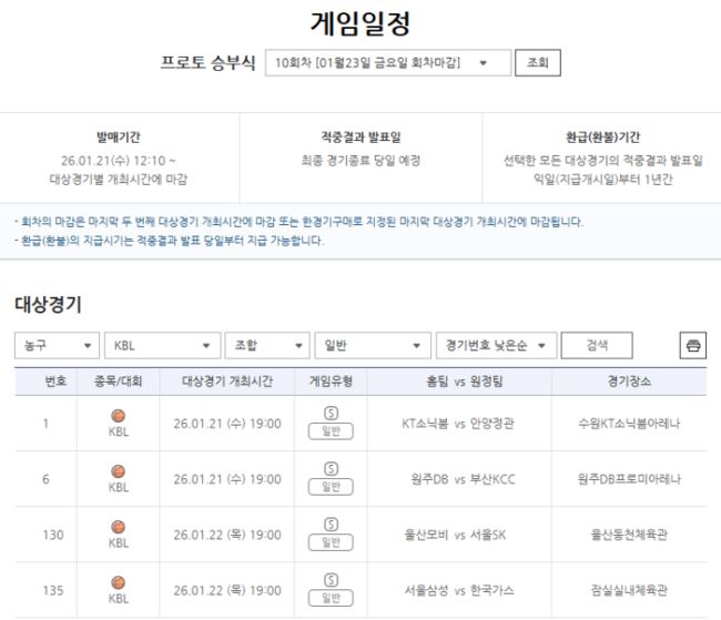 프로토 10회차 주중 KBL 대상 경기 정보. 사진 | 한국스포츠레저 21~22일 오후 7시에 열리는 국내 프로농구(KBL) 주중 경기들을 대상으로 하는 프로토 승부식 10회차가 발매를 개시했다. 이번 회차에는 21일 오후 7시 열리는 수원 KT-안양 정관장, 원주 DB-부산 KCC전을 비롯해 22일 같은 시간 개최되는 울산 모비스-서울 SK, 서울 삼성-