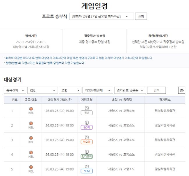 서울올림픽기념국민체육진흥공단이 발행하는 체육진흥투표권 스포츠토토의 수탁사업자 한국스포츠레저가 25일 오후 7시에 잠실학생체육관에서 열리는 2025~2026 KBL 서울 SK(홈)-고양 소노(원정)전을 대상으로 한 프로토 승부식 38회차 게임이 발매 마감을 앞두고 있다고 밝혔다. 이번 경기를 대상으로 하는 프로토 승부식 38회차는 ▲일반(1번) ▲승5패(2번