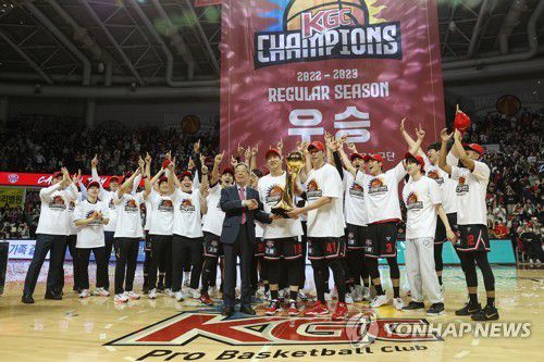 (안양=연합뉴스) 신현우 기자 = 26일 경기도 안양체육관에서 열린 2022-2023 SKT 에이닷 프로농구 정규리그 안양 KGC인삼공사와 원주 DB 프로미의 경기가 끝난 뒤 정규리그 우승을 확정한 KGC 선수들이 김희옥 KBL 총재로부터 트로피를 받고 있다. 앞서 2위 창원 LG 세이커스가 패배하며 정규리그 우승을 확정한 KGC는 개막부터 종료일까지 정규