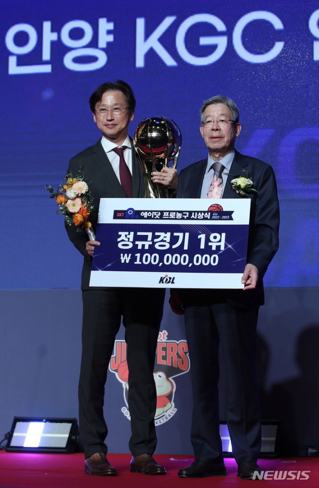 [서울=뉴시스] 고승민 기자 = 30일 서울 강남구의 한 호텔에서 열린 2022-2023 프로농구 시상식에서 이종림 안양 KGC 단장이 김희옥 KBL 총재에게 정규리그 1위 트로피를 받은 뒤 기념촬영하고 있다. 2023.03.30. kkssmm99@newsis.com [사진 영상 제보받습니다] 공감언론 뉴시스가 독자 여러분의 소중한 제보를 기다립니다. 뉴스