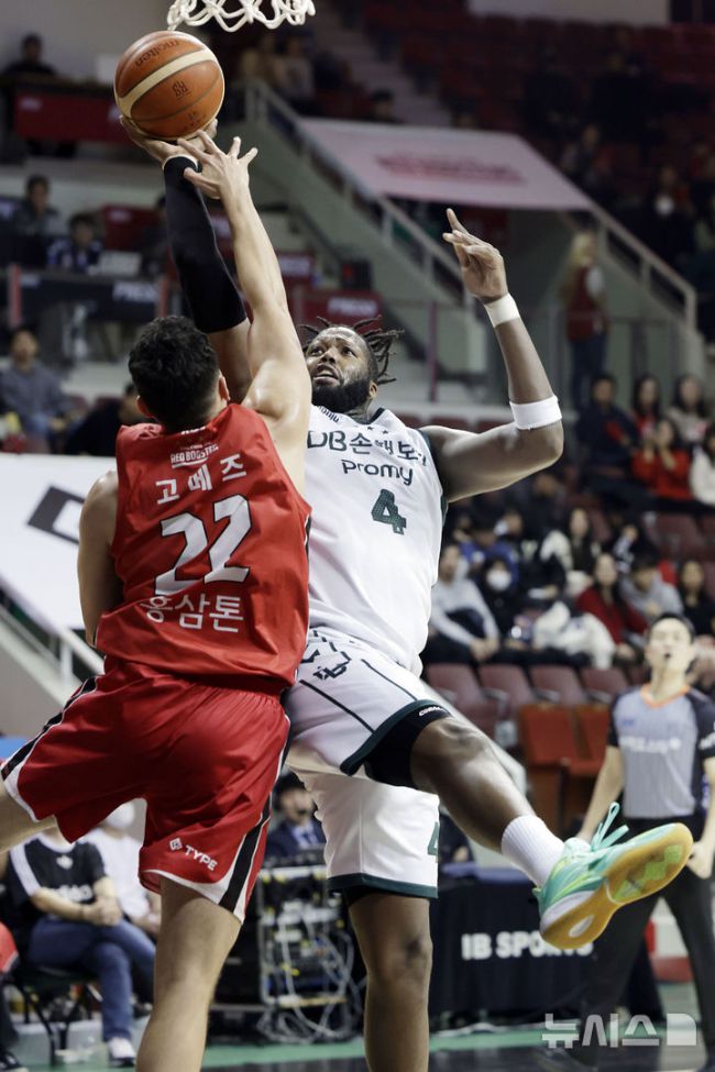 [안양=뉴시스] 최동준 기자 = 지난 1월22일 경기 안양정관장아레나에서 열린 2024-2025 KBL 리그 원주 DB 프로미와 안양 정관장 레드부스터스의 경기, DB 로버트 카터가 정관장 하비 고메즈의 수비를 피해 공격을 시도하고 있다. 2025.01.22. photocdj@newsis.com [서울=뉴시스] 김진엽 기자 = 프로농구 2024~2025시즌