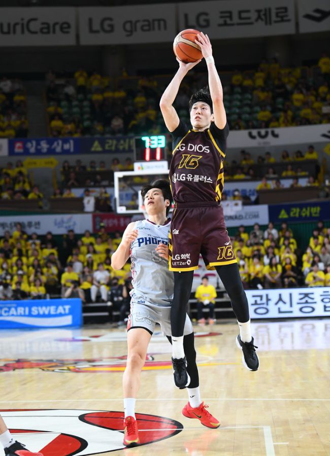 [서울=뉴시스] 프로농구 창원 LG의 정인덕. (사진=KBL 제공) [서울=뉴시스] 하근수 기자 = 프로농구 창원 LG가 울산 현대모비스를 꺾고 4강 플레이오프(PO·5전3선승제) 1차전에서 귀중한 승리를 챙겼다. LG는 24일 오후 7시 창원체육관에서 열린 현대모비스와의 2024~2025시즌 KCC 프로농구 4강 PO 1차전 홈 경기에서 67-64로 이겼
