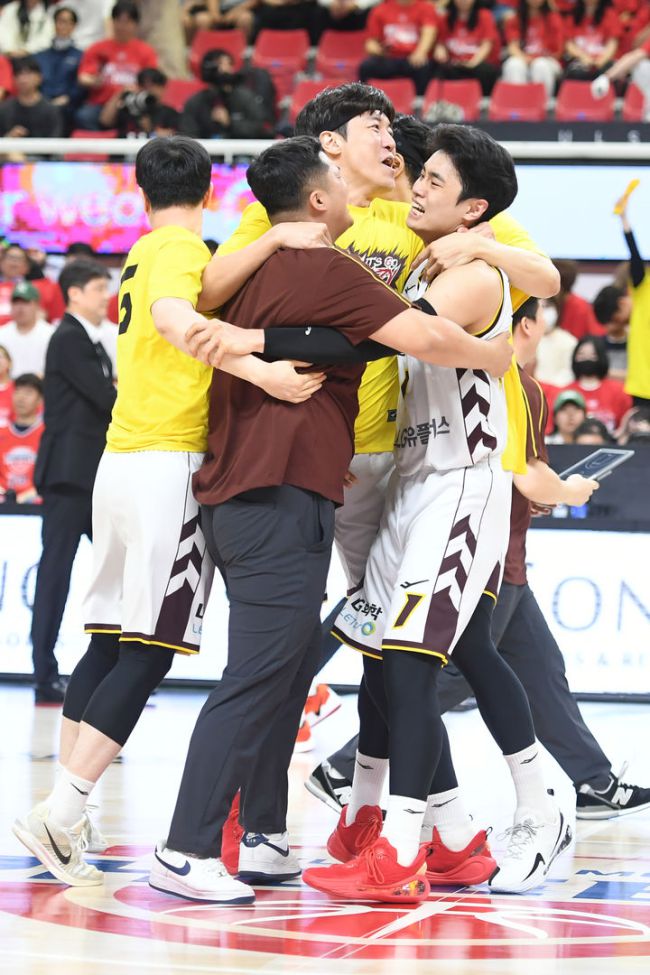 [서울=뉴시스] 28일 울산 동천체육관에서 열린 2024-2025 KCC 프로농구 4강 플레이오프 울산 현대모비스와 창원 LG의 3차전에서 76-74로 승리한 LG 선수들이 기뻐하고 있다.(사진=KBL 제공) 2025.04.28. photo@newsis.com *재판매 및 DB 금지 [사진 영상 제보받습니다] 공감언론 뉴시스가 독자 여러분의 소중한 제보를