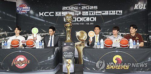 (서울=연합뉴스) 김성민 기자 = 서울 SK 나이츠 전희철 감독(왼쪽 세번째)과 창원 LG 세이커스 조상현 감독(왼쪽 네번째)이 1일 서울 강남구 KBL센터에서 열린 '2024-2025 KCC 프로농구 챔피언결정전 미디어데이'에서 예상 경기 수를 묻는 질문에 손팻말을 들어 답하고 있다. 2025.5.1 ksm7976@yna.co.kr ▶제보는 카카오톡 ok