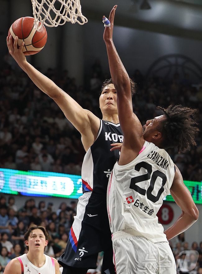 (안양=뉴스1) 김진환 기자 = 13일 오후 경기도 안양 정관장 체육관에서 열린 하나은행 초청 2025 남자농구 국가대표 평가전 대한민국과 일본의 경기, 대한민국 안영준이 4쿼터 일본의 야마자키 이부의 수비 앞에서 레이업 슛을 성공하고 있다. 2025.7.13/뉴스1 kwangshinQQ@news1.kr Copyright ⓒ 뉴스1. All rights r